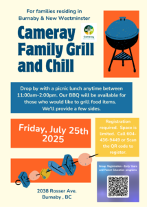 Our BBQ will be fired up and ready if you’d like to grill, and we’ll have a few tasty sides to share. There will be some fun activities for children and parents to engage in before or after you eat. Come and go as you please. This group is at Cameray, 2038 Rosser Avenue, Burnaby.