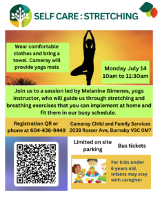 Come and join us to a session led by our guest Melanine Gimenes, yoga instructor, will guide us through stretching and breathing exercises that we can implement at home and fit them in with our busy schedule. Wear comfortable clothes. Bring a towel. Cameray will provide yoga mats unless you prefer to bring yours. Children must be in the childminding room.