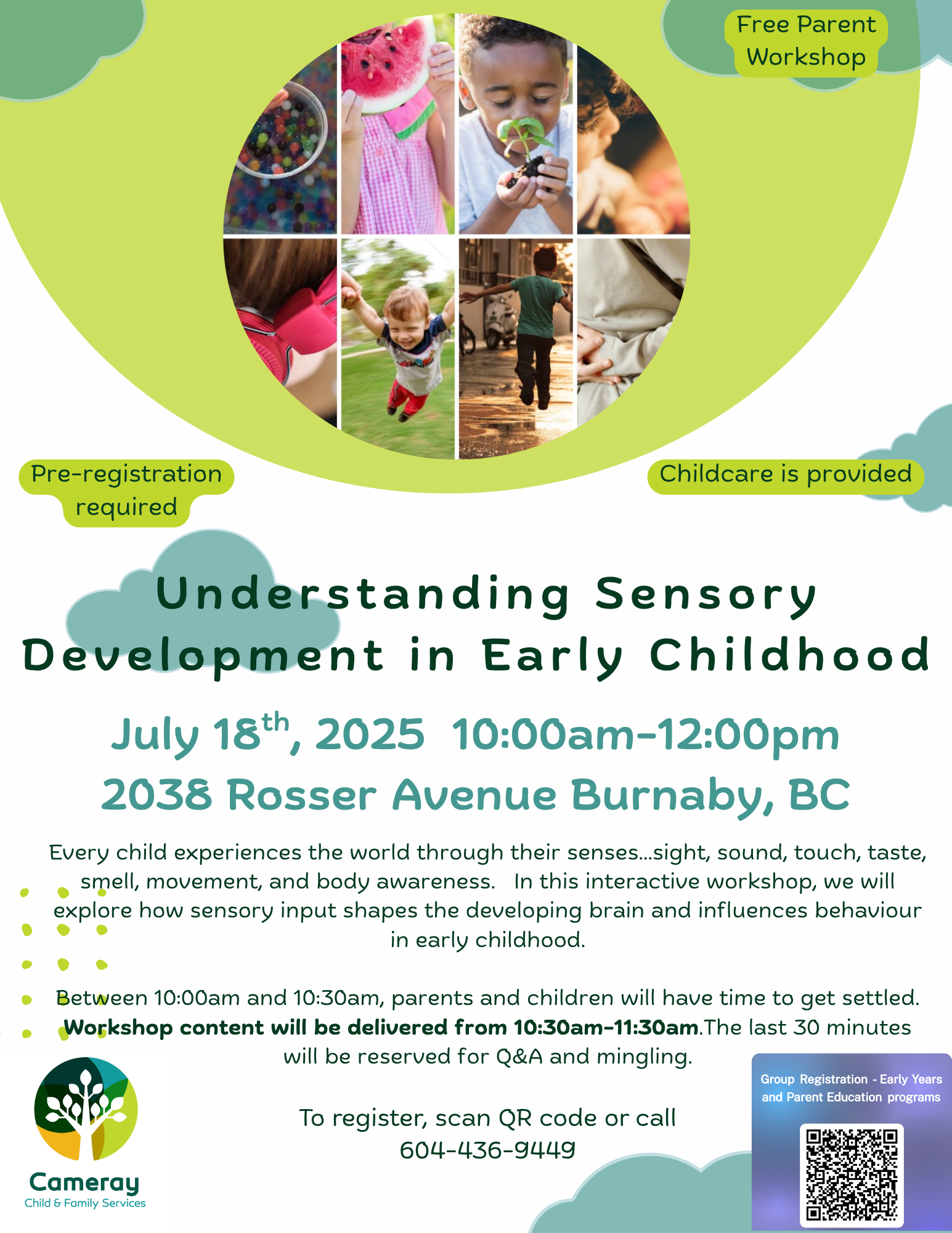 These sensory experiences are not just about play; they are essential for brain development, emotional regulation, and learning. In this interactive workshop, we will explore how sensory input shapes the developing brain and influences behaviour in early childhood. You’ll learn how to recognize and respond to young children’s sensory needs, and gain insight about how your child senses the world. Between 10:00am and 10:30am, parents and children will have time to get settled. Workshop content will be delivered from 10:30am-11:30am.