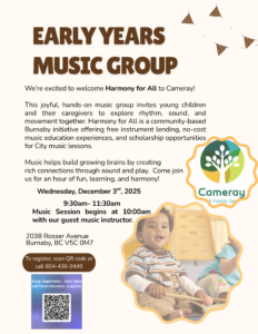 This joyful, hands-on music group invites young children and their caregivers to explore rhythm, sound, and movement together. Harmony for All is a community-based Burnaby initiative offering free instrument lending, no-cost music education experiences, and scholarship opportunities for City music lessons. Music helps build growing brains by creating rich connections through sound and play.  Come join us for an hour of fun, learning, and harmony!