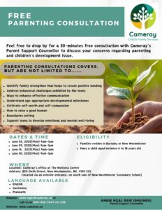 You are welcome to drop by for a 30-minutes free consultation with Cameray’s Parent Educator to discuss your concerns regarding parenting and children (aged 6 to 18) development concerns.