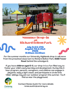 Summer Drop-in at Richard Bolton Park: Visit our parent child drop-in program in partnership with University Highlands Elementary and the City of Burnaby.