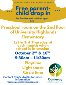 Visit our parent child drop-in program in partnership with University Highlands Elementary and the City of Burnaby.