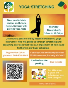Come and join us to a session led by our guest Melanine Gimenes, yoga instructor, who will guide us through stretching and breathing exercises that we can implement at home and fit them in with our busy schedule. Wear comfortable clothes. Bring a towel. Cameray will provide yoga mats unless you prefer to bring yours. Children must be in the childminding room.