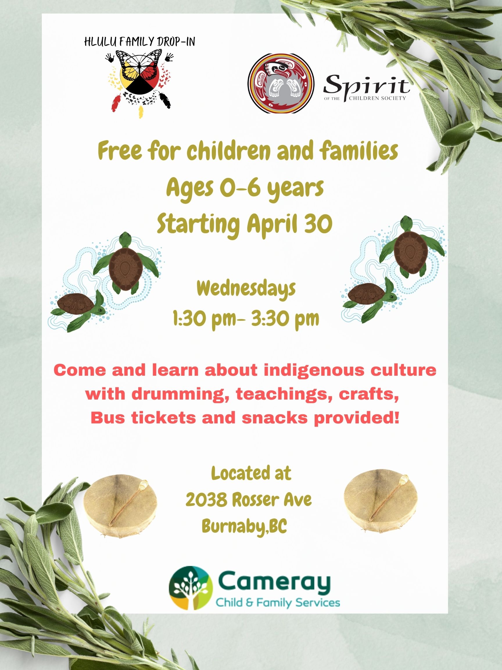 - HLULU FAMILY DROP-IN – come and learn about indigenous culture with drumming, teachings, and crafts every Wednesdays from September 10th to December 17th, 2025 at 1:30 pm to 3:30 pm. Click here to see the poster