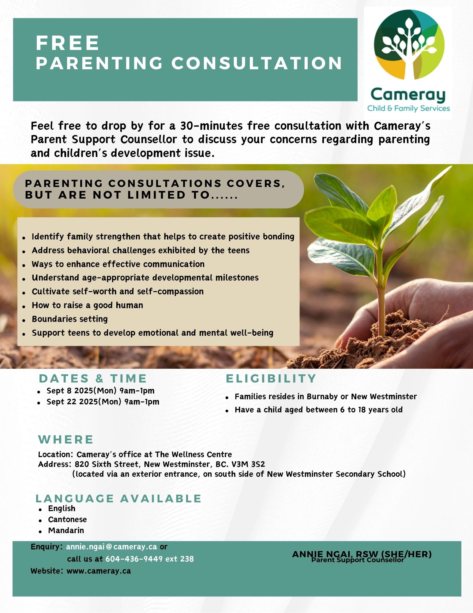 You are welcome to drop by for a 30-minutes free consultation with Cameray’s Parent Educator to discuss your concerns regarding parenting and children (aged 6 to 18) development concerns. Parenting consultations cover, but are not limited to: Identifying families strengthen their skills to help create positive bonding Addressing behavioral challenges exhibited by tweens and teens…